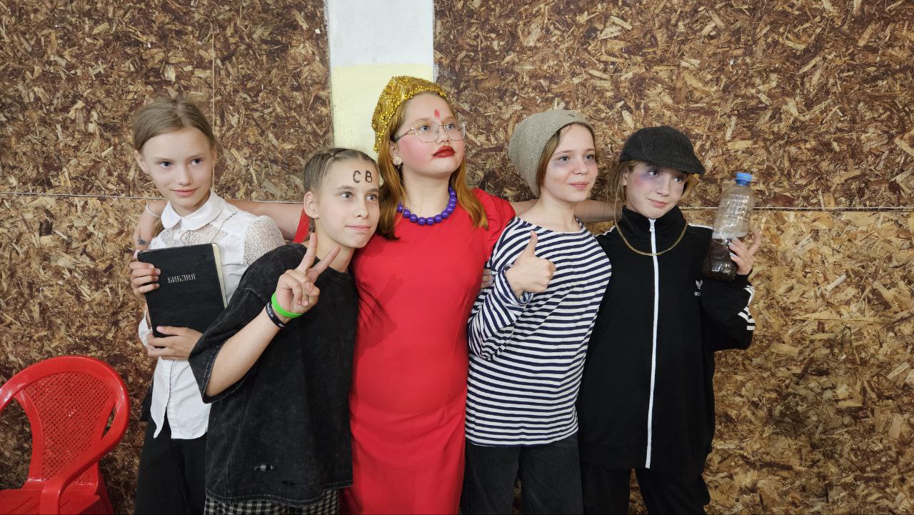 Five children in costume pose for a photo indoors; one wears a red dress and crown, others are dressed in black and striped outfits, holding props and gesturing to the camera.