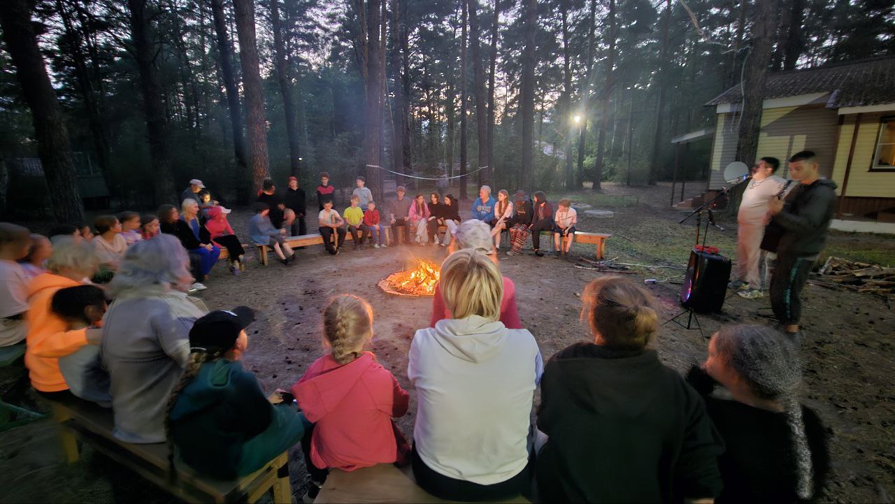 A large group of people, including children and adults, sit in a circle around a campfire in a wooded area near a cabin at dusk.