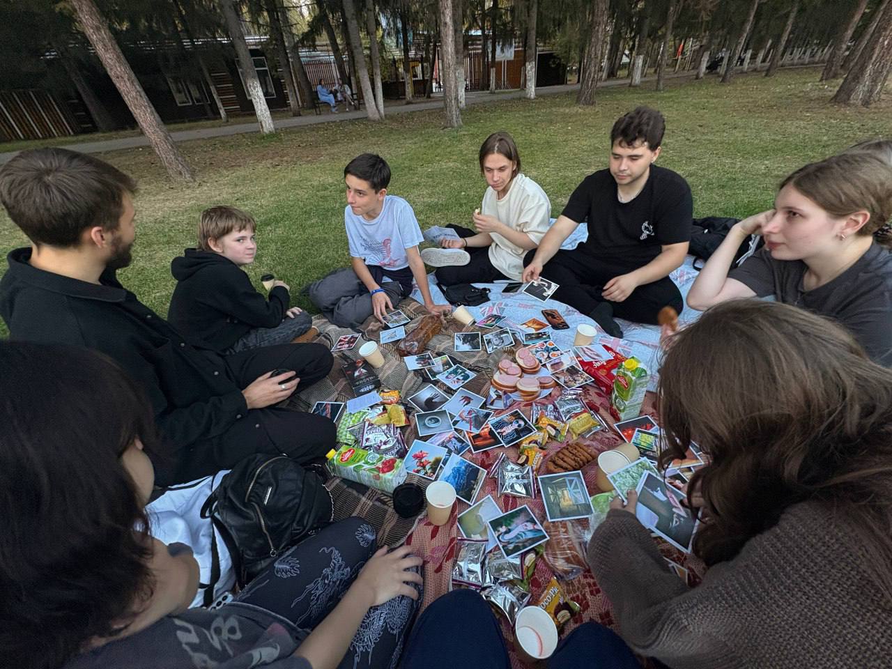 A group of people sit on a picnic blanket outdoors, surrounded by snacks, drinks, and scattered instant photos. They appear to be talking and relaxing in a park setting.