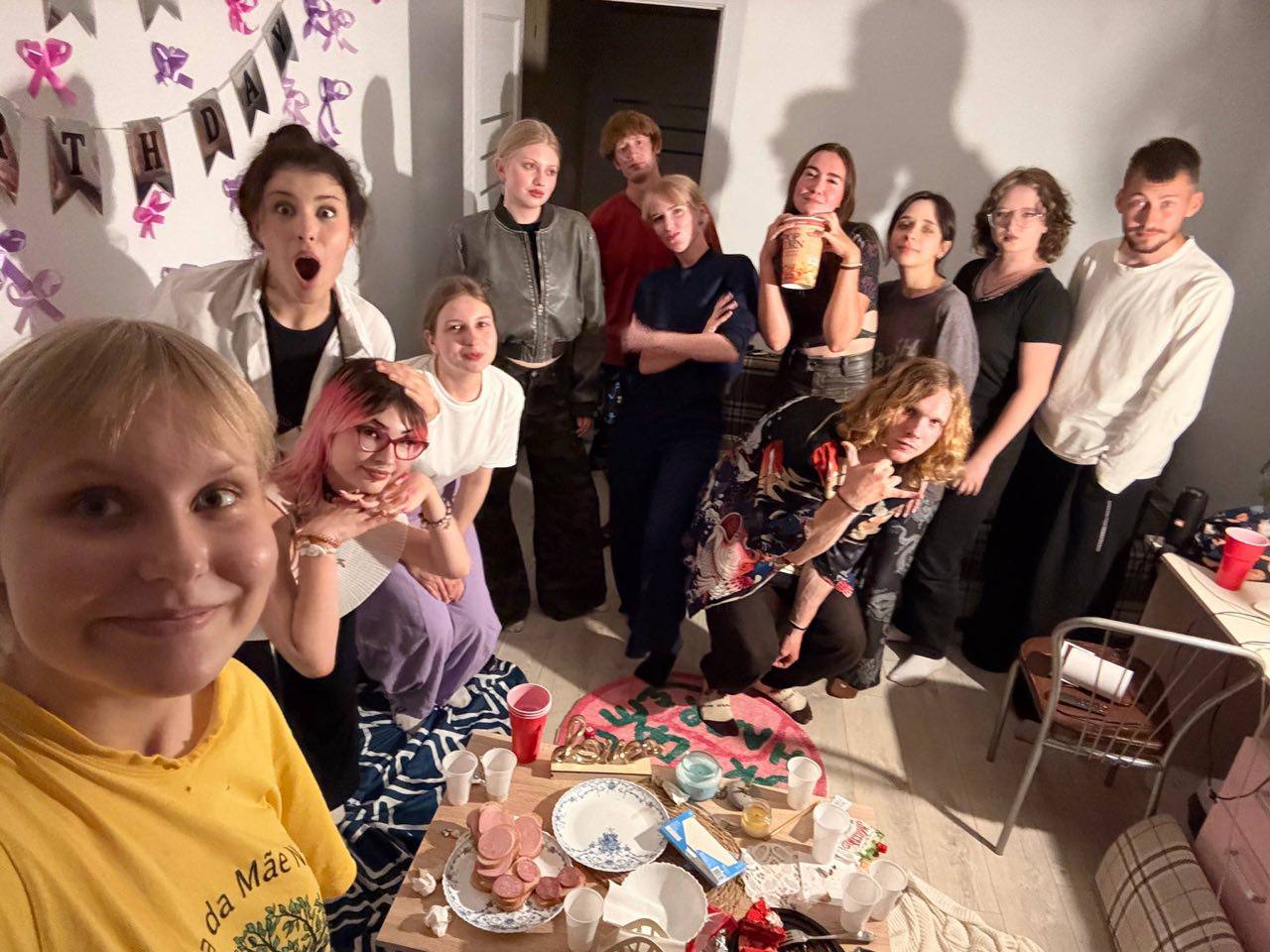 A group of eleven people pose for a photo in a decorated room with a table of snacks, party cups, and a “Happy Birthday” banner on the wall.